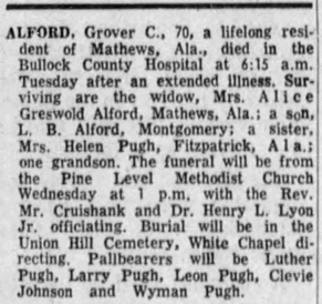 The families of many of the subjects of these Alabama obituaries are represented in AAFA Alford Genealogies published on this website, where we are referring readers for more information.