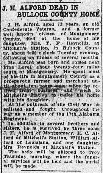 AAFA NOTES: See the obituaries of his wife, Janie Robinson Alford; and his brothers Alton Calvin Alford and Pleasant Marshall Alford in this compilation.