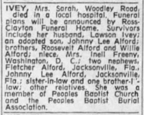 Survivors include two sons, Arthur James Alford, and Willie Ben Alford Jr.; sister, Mrs. Inell Freeny, Washington, D.C.; two brothers, Johnny Lee Alford, and Fletcher Alford Jr., Jacksonville, Fla.; three uncles, Roosevelt Alford, Willie Alford, and Lawson Ivory; five aunts; two sisters-in-law; one brother-in-law; other relatives.