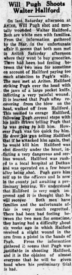 Mr. W.T. Hallford (Uncle Bill as he was better known) who lived near Red Level on Route 2 died Friday night June 8 after 10 days illness.