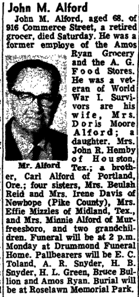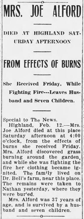 See the obituaries of his wife, Lillie Pearl Frix Alford; daughter Velma Alford Brazil; siblings Charles Andrew Alford, Eliza Alford Ewing, Joseph Daniel Alford, and Nancy Rebecca Alford Pate; and half-brother Gilbert Arland Alford in this compilation.