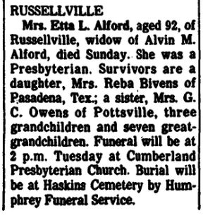 Survivors include two sons, Donald R. Alford and Roy Alford of Russellville; a daughter, Martha Williamson of Lima, Ohio; a brother, Alva Alford of Nashville; two sisters, Thera Dossey of Nash, Texas, and Flora Swinney of Longview, Texas; nine grandchildren, and 11 great grandchildren.