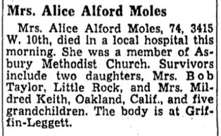 AAFA NOTES: SSDI records confirm the birth and death dates of Alice M. Alford (SS# issued in AR), last residence not listed.