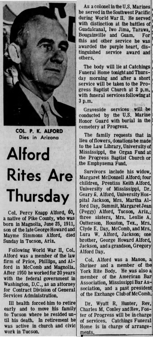 We included the obituaries of his wife, Helen Louise Dunavent Alford; parents, Joseph Isaiah Edmund Alford and Delita Catherine Clift Alford; and siblings Alberta Mae Alford Shutz, Frances Clift Alford Patrick, Hazel Laverne Alford McKee, Justice Edmond “Judd” Alford, and Mary Ethel Alford in Indiana Obituaries.