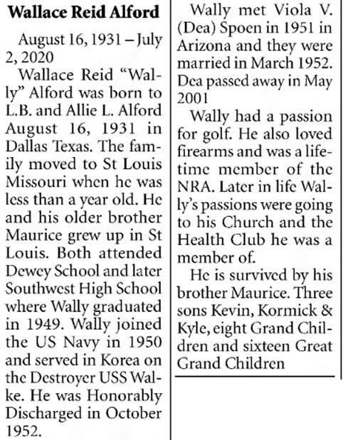 We included the obituaries of his parents, William H. Alford and Hilda Ethel McLane Alford; and sister Marguerite Alene Alford Nedved in South Dakota Obituaries; and of his sister Bonnie Jane Alford Hinzman in Oregon Obituaries.