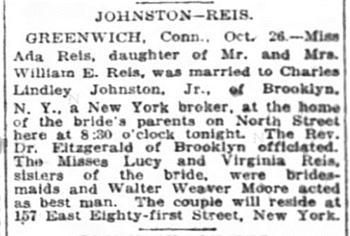 In 1920, Pasadena, Los Angeles Co., CA: William E. Reis, age 69 born PA; his wife Clara T. 58 KY; son William E. 32 PA; daughter Ada Johnston 24 PA, married; and 3 servants.