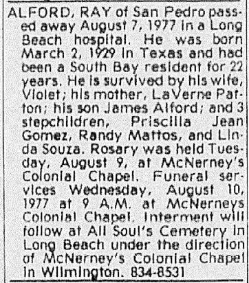 AAFA NOTES: SSDI records confirm the birth and death dates of William Alford (SS# issued in CA), last residence Chino, San Bernardino Co., CA.