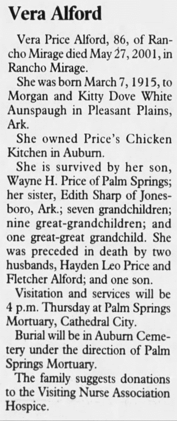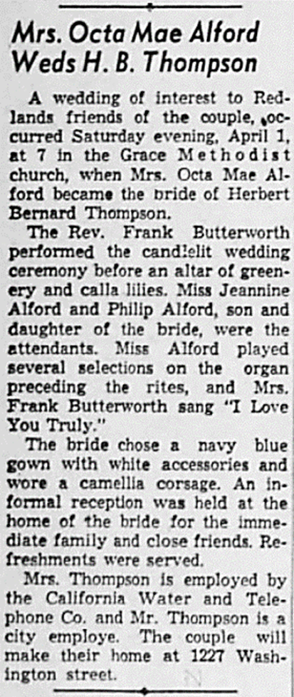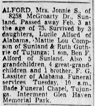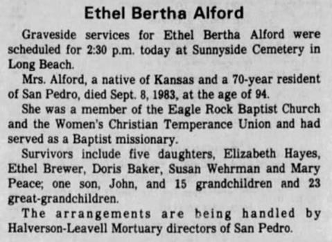 See the obituaries of her first husband, Ryland Felix “Jack” Alford; and son Jack Milton Alford in this compilation.
