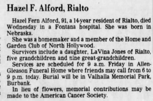 AAFA NOTES: SSDI records confirm the birth and death dates of Zelda Angela Alford (SS# issued in CA), last residence Stockton, San Joaquin Co., CA.