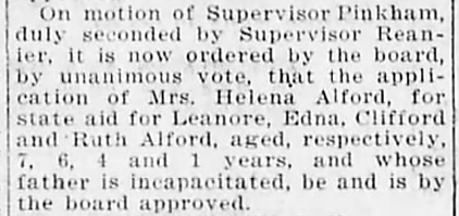 AAFA NOTES: SSDI records show that Ada Alford (SS# issued in CA) was born 13 July 1893 and died _____ March 1984, last residence Palm Springs, Riverside Co., CA.