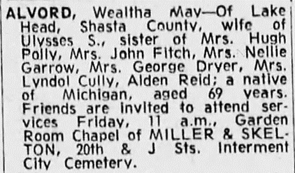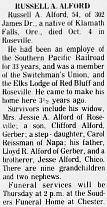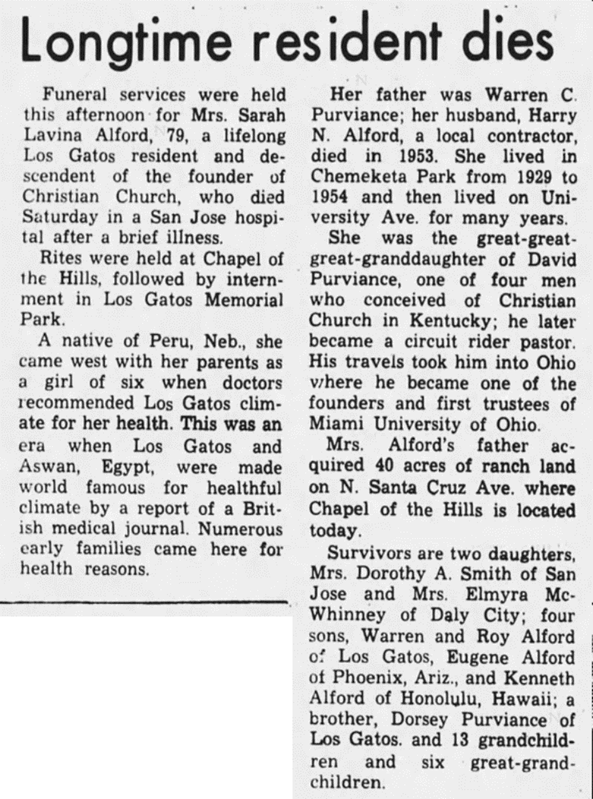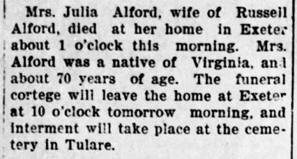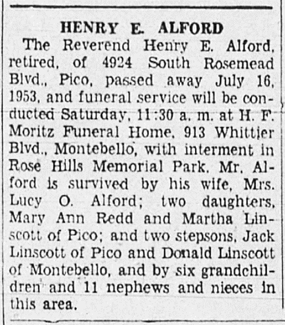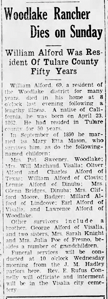 The families of many of the subjects of these California obituaries are represented in AAFA Alford Genealogies published on this website, where we are referring readers for more information.