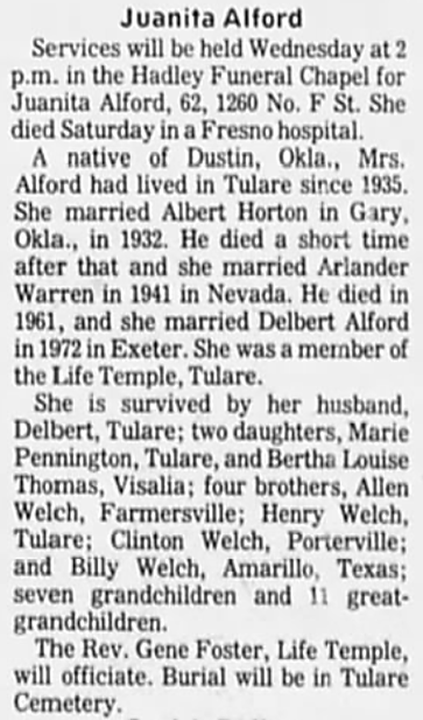 See the obituaries of his father, Lemuel Webber “Lemmie” Alford; and sister Etta Julia Alford Beaird in this compilation. We included the obituary of his sister Bernice Hazel Alford Polasek McCoy in Texas Obituaries.