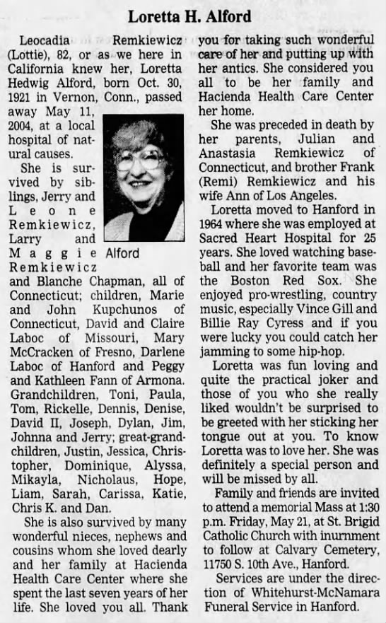 Obituaries are listed alphabetically by FIRST name. Included are people whose last name, maiden name, or married name is Alford or a spelling variation: Alfred, Alvord, Allford, Halford, Hallford, Holford, etc.