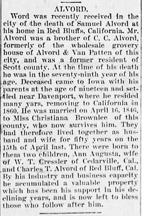 From CA Deaths: William Sherman Alford was born 26 Feb 1865 [different than gravestone and 1900 census] in IN, mother’s maiden name Goldsmith. He died 28 March 1940 in San Joaquin Co., CA.