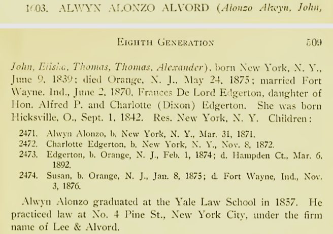 See also Open Library’s A Genealogy of the Descendants of Alexander Alvord, by Samuel Morgan Alvord (Webster, NY: A.D. Andrews, printer, 1908)