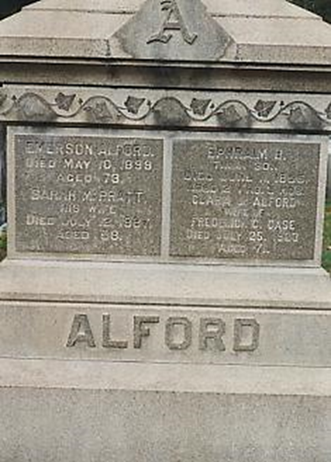 She was a native of Bloomfield and was the youngest daughter of Ira and Phebe Fisher Cadwell. She was born March 22, 1834, and was married to Mr. Alford, November 13, 1855. Shortly afterwards Mr. and Mrs. Alford came here where they made their home.