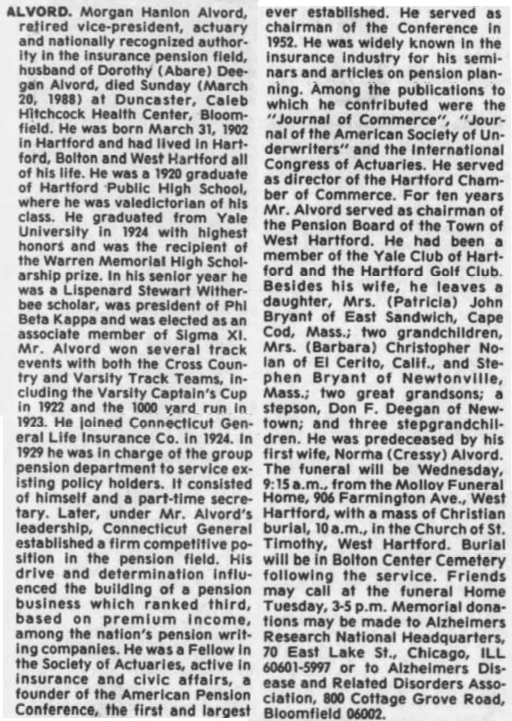 AAFA NOTES: SSDI records show that Wesley P. Alvord (SS# issued in CT) was born 29 Oct 1912, last residence Manchester, Hartford Co., CT.