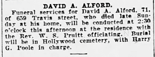 The Alford American Family Association (AAFA) often adds notes to each obituary, including Social Security Death Index (SSDI) data, relationship of the deceased to other Alfords, and lineages. We add to AAFA NOTES as time permits.