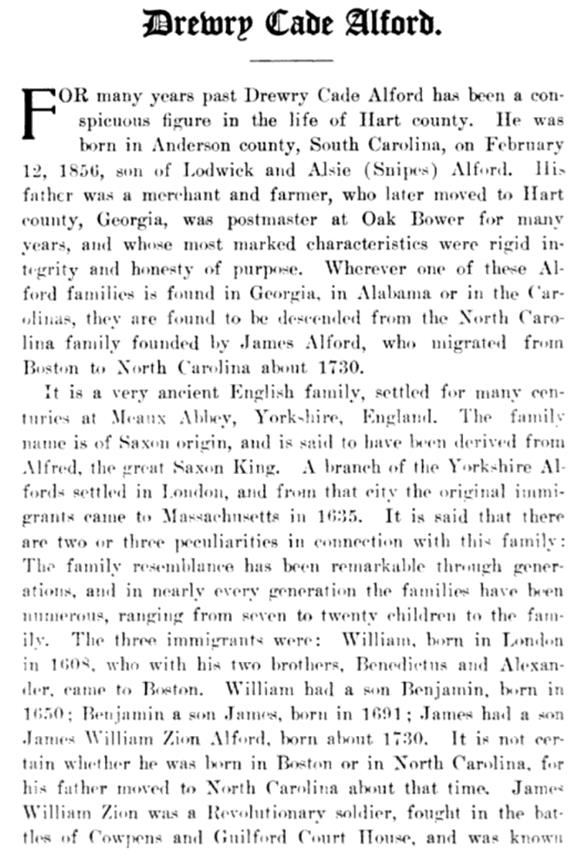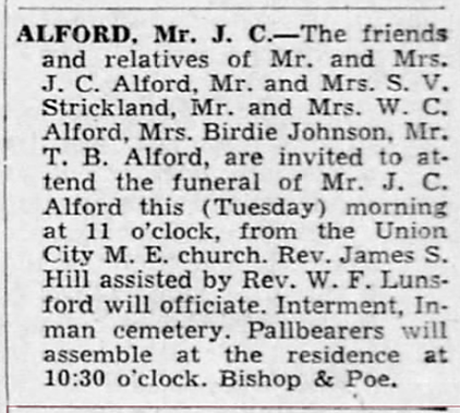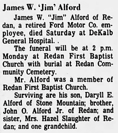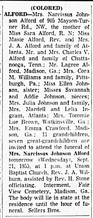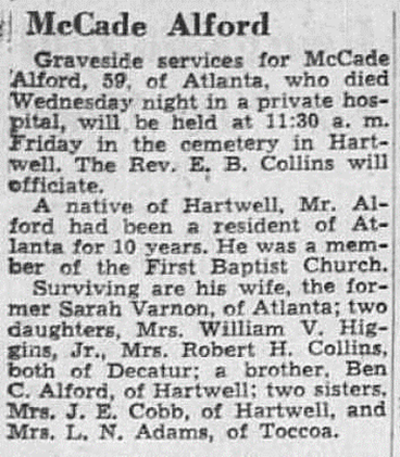 The families of many of the subjects of these Georgia obituaries are represented in AAFA Alford Genealogies published on this website, where we are referring readers for more information.