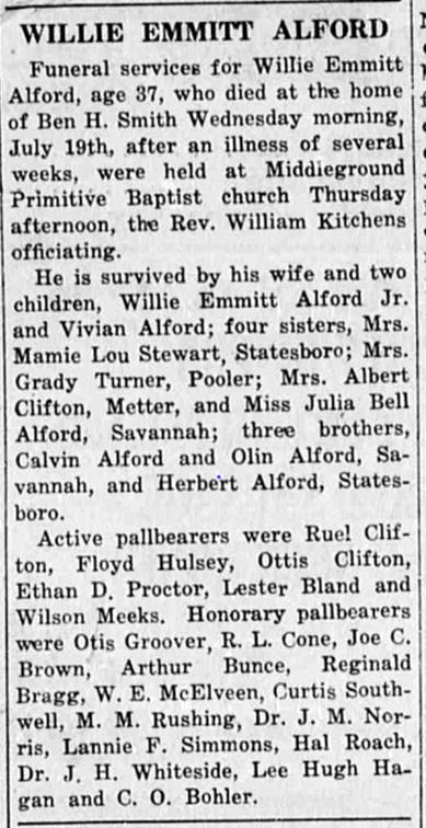AAFA NOTES: SSDI records confirm the birth and death dates of Willie Alford (SS# issued in GA), last residence Grovetown, Columbia Co., GA.