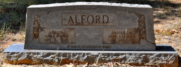 Mockingbird Hill Cemetery is also known as Alex P. Blackwell Cemetery, where her father, sister Calonie P. “Gertie” Alford Sandifer, and brother Walter McCallee Alford are also buried.