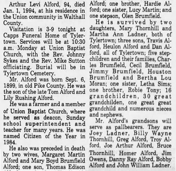 AAFA NOTES: See the obituaries of his wife, Dora Geneva Burns Alford; sons Dudley Wright Alford, James Buford Alford, Julius Plemon Alford, and Marvin Bradford Alford; and mother, Elsie Virginia Smith Alford; and siblings Hugh Allen Alford Sr. and Rebecca Jane Alford Phillips Nelms in this compilation