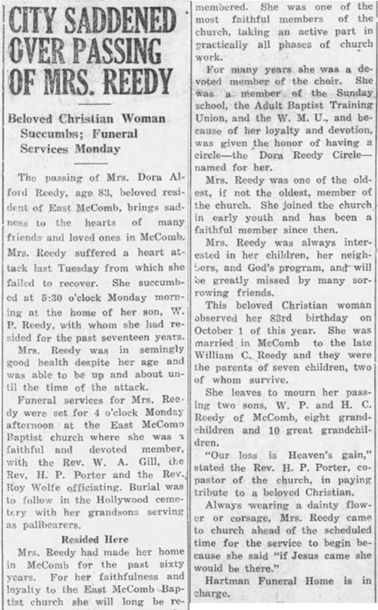 Funeral services for Mrs. Addie Alford, 83, a resident of 661 Lawrence Road, will be held Friday at 12:30 p.m. from the graveside of Cedar Lawn Cemetery…. Mrs. Alford died Thursday morning at a local hospital after a short illness.