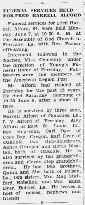 See the obituaries of his parents, Jacob Elias Alford and Josephine Bertha Egloff Alford; brothers James Louis Alford and John Warren Alford (AAFA #0194), and his half-sister, Ella Quin Alford Mixon, in this compilation. We included the obituary of his brother Jacob Egloff Alford (AAFA #0016) in Louisiana Obituaries.