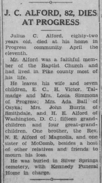 AAFA NOTES: See the obituaries of his wife, Sarah Elizabeth Fortenberry Alford; sons DeWitt Talmadge and Hollis Victor Alford; and brother Needham Edwin Alford in this compilation. We included the obituaries of his son Hugh Edwin Alford in District of Columbia Obituaries; and of his brother Jesse Lewis Alford in Louisiana Obituaries.