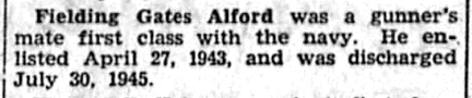 On Willis Gales Alford’s 1942 WWII Draft Registration Card (Ancestry), he is age 19, born 23 Apr 1923 in Shelby, Toole Co., MT, his current residence. Mrs. Mary Alford is his contact. A handwritten says “Physical discharge from Navy March 10 1943.”