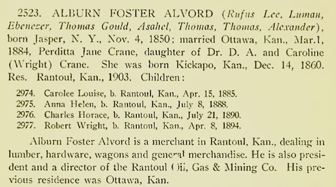 His probable ALVORD lineage: Alfred Paul 1909 OK1, Fayette Charley 1879 MO2, Franklin Jared 1849 MI3, Americus Vespucius 1813 NY4, Elisha 1778 CT5, (probably) Elisha 1748 CT6, Asahel 1720 MA7, Thomas 1683 MA8, Thomas 1653 CT9, Alexander 1627 England10, Thomas [ALFORD] 1598 England11.