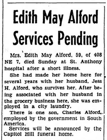AAFA NOTES: SSDI records show that Alice Alford (SS# issued in OK) was born 10 Feb 1907 and died _____ Jan 1973 last residence Oklahoma City, Oklahoma Co., OK..