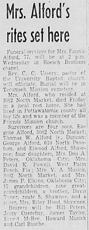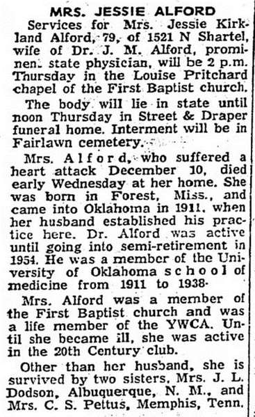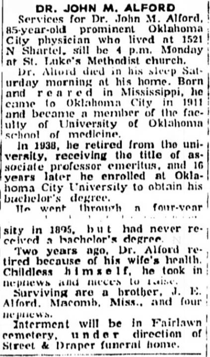 The families of many of the subjects of these Oklahoma obituaries are represented in AAFA Alford Genealogies published on this website, where we are referring readers for more information.