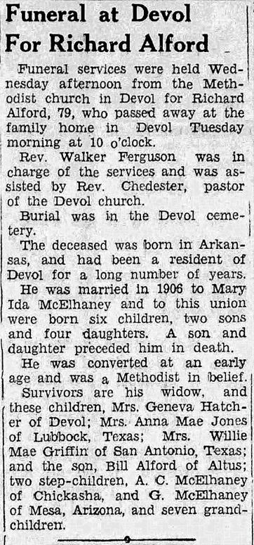 See the obituaries of his wife, Daisye Bailey Alford; and son Garland Bailey Alford in this compilation. We included the obituaries of his father, John Rankin Alford; and half-siblings Etta Ora Alford Nance, John Addison Alford, and Laura Elizabeth Alford Cox in Texas Obituaries.